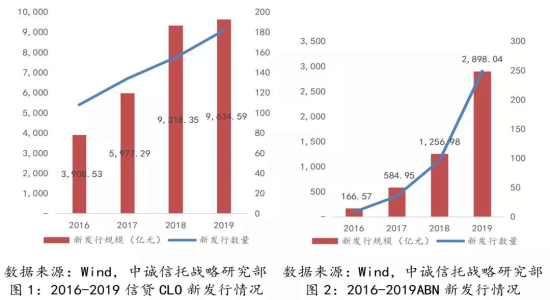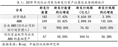 信托公司參與的存量資產(chǎn)證券化業(yè)務(wù)方面,截至2019年底,信貸CLO存量規(guī)模達(dá)到1.44萬(wàn)億,同比增長(zhǎng)31%;ABN存量規(guī)模達(dá)到3729.24億元,同比增長(zhǎng)120%;以信托受益權(quán)作為基礎(chǔ)資產(chǎn)的企業(yè)ABS存量規(guī)模達(dá)到1647.17億元,同比增長(zhǎng)18.99%。