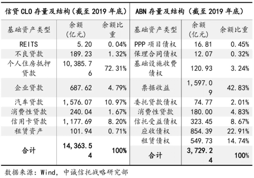 信托參與的存量資產(chǎn)證券化業(yè)務(wù)中,基礎(chǔ)資產(chǎn)結(jié)構(gòu)與新發(fā)行情況相似。根據(jù)2019年底的存量數(shù)據(jù),存量信貸CLO中,個(gè)人房貸、車(chē)貸、信用卡貸占比居于前三,個(gè)人房貸占比超過(guò)七成,三類(lèi)基礎(chǔ)資產(chǎn)合計(jì)占比超過(guò)九成;存量ABN中,票據(jù)收益、應(yīng)收債權(quán)、租賃債權(quán)占比居于前三,三類(lèi)基礎(chǔ)資產(chǎn)合計(jì)占比超過(guò)八成。