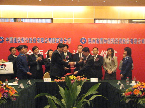 2007年2月12日下午,我公司與中國建設(shè)銀行股份有限公司陜西省分行在喜來登大酒店簽署了《全面合作協(xié)議書》,拉開了兩家單位在21個(gè)方面進(jìn)行全面合作的帷幕。公司黨委書記、董事長薛季民、黨委副書記兼紀(jì)委書記黎惠民、副總裁何熙平、副總裁趙輝、總會(huì)計(jì)師李玲及信托部門有關(guān)人員等參加了簽字儀式。建設(shè)銀行陜西省分行行長曾益、副行長魏承國,省分行機(jī)構(gòu)業(yè)務(wù)部總經(jīng)理于卉、省分行個(gè)人金融業(yè)務(wù)部總經(jīng)理?xiàng)罾竦瘸鱿炞謨x式。薛季民董事長、曾益行長先后發(fā)表了熱情洋溢的講話,共同祝愿雙方取得實(shí)質(zhì)性合作,實(shí)現(xiàn)雙贏。