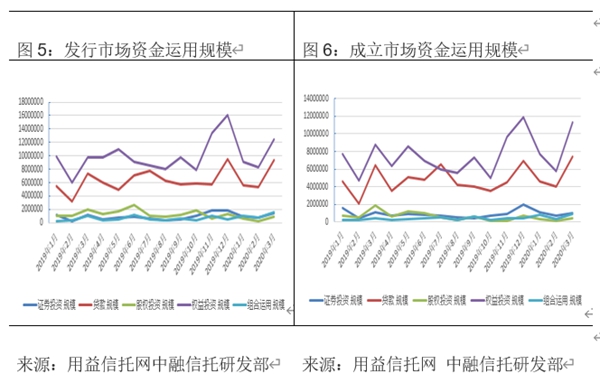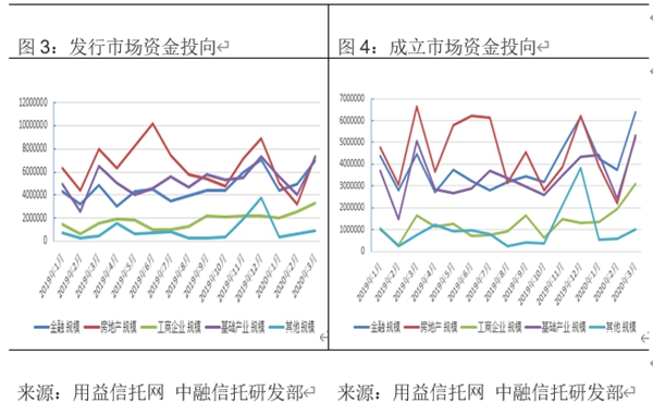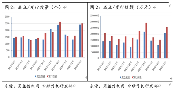 用益信托公布的數(shù)據(jù)顯示,逐步復工后,3月集合信托市場發(fā)行和成立市場出現(xiàn)強勢反彈。具體來看,2020年3月共有59家信托公司參與發(fā)行,56家信托公司成立產(chǎn)品。其中發(fā)行產(chǎn)品數(shù)量2512個,環(huán)比上漲57.9%,成立產(chǎn)品數(shù)量2439個,環(huán)比上漲85.8%;發(fā)行和成立產(chǎn)品規(guī)模方面同樣表現(xiàn)良好,其中發(fā)行市場規(guī)模2572.08億元,環(huán)比增長66.7%,成立市場規(guī)模2103.57億元,環(huán)比上漲92.2%。發(fā)行和成立規(guī)模在放在2019年來看,也僅低于12月,規(guī)模排在第二位。
