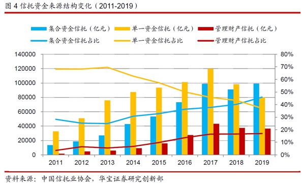 與此同時,為適應(yīng)監(jiān)管政策變化,信托公司業(yè)務(wù)開展逐步轉(zhuǎn)型,普遍加強(qiáng)財富渠道建設(shè),增強(qiáng)主動管理能力,集合資金信托占比穩(wěn)定上升。2019年末,存量集合資金信托規(guī)模9.92萬億,規(guī)模較年初增加8121億元,規(guī)模占比由年初的40.12%提升到45.93%。
