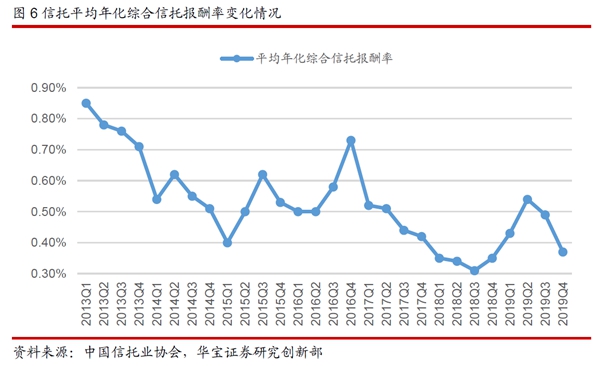從上述兩個角度來分析信托產(chǎn)品的結(jié)構(gòu)我們可以發(fā)現(xiàn),“資管新規(guī)”落地后,通道與多層嵌套業(yè)務(wù)不斷清理與壓縮,信托公司主動管理能力增強(qiáng),信托業(yè)務(wù)結(jié)構(gòu)優(yōu)化。這帶動了信托報酬率從2018年四季度開始連續(xù)3個季度的回升,2019年二季度平均年化綜合報酬率為0.54%,相對于2018年三季度的階段性低點(diǎn)提高0.23個百分點(diǎn)。不過由于2019年下半年監(jiān)管部門加大了風(fēng)險排查的力度和頻率,之前被隱匿的風(fēng)險得到了更加充分的暴露,使得信托報酬率在下半年出現(xiàn)了回落。