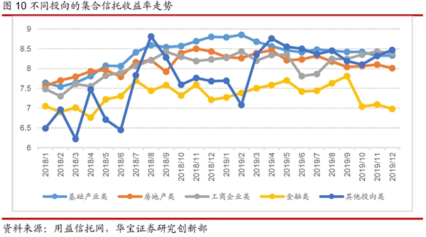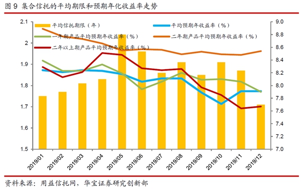 產(chǎn)品收益:根據(jù)用益信托網(wǎng)不完全數(shù)據(jù)顯示,2019年,已公布的集合理財類信托產(chǎn)品的平均收益率為8.16%,與2018年相比平均收益率上行22個bp;其平均信托年限為1.86年,與2018年持平。從預(yù)期年化收益率的趨勢來看,2019年月度新發(fā)集合信托平均預(yù)期年收益率呈明顯的下降趨勢。疫情加大經(jīng)濟(jì)衰退風(fēng)險,全球流動性大幅投放,“資產(chǎn)荒”的壓力進(jìn)一步增大,預(yù)計2020 年集合信托產(chǎn)品的平均預(yù)期收益率仍然有一定的下行空間。