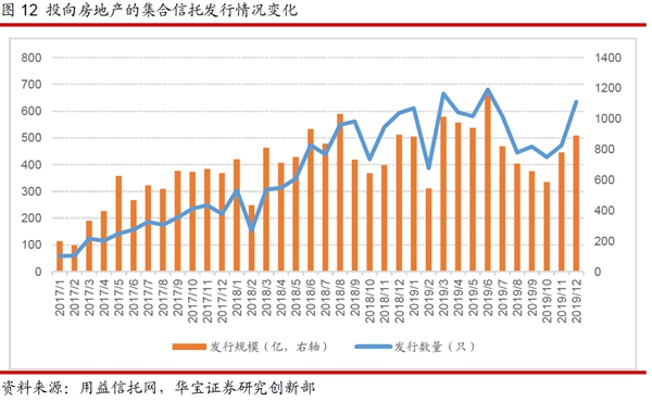 投向房地產(chǎn)的信托規(guī)模為2.70萬億,較2018年末增加165億元,規(guī)模占比為15.07%,上升0.89個百分點(diǎn)。2019年下半年地產(chǎn)融資收緊之前,“寬信用”的政策基調(diào)下,房地產(chǎn)面臨的融資環(huán)境比較友好。同時地產(chǎn)銷售階段性的好轉(zhuǎn)疊加房企執(zhí)行“高周轉(zhuǎn)”的戰(zhàn)略,加速推盤,加速開工,融資需求明顯回升,帶動了2019年上半年房地產(chǎn)信托融資的大幅回升。到了下半年,由于地產(chǎn)融資收緊,房地產(chǎn)信托的發(fā)行也受到了一定的影響。