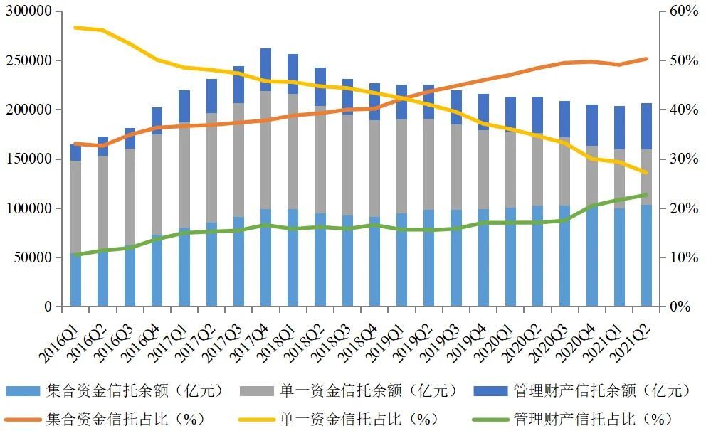 基于信托資產(chǎn)來源的占比變化,可以明顯看到信托業(yè)轉(zhuǎn)型的成果。資管新規(guī)頒布以來,在信托資產(chǎn)規(guī)模持續(xù)壓縮的背景下,集合資金信托的規(guī)模整體保持平穩(wěn),但占比持續(xù)提高,2021年2季度末達(dá)到50.23%,首次突破50%,較2017年末(37.74%)上升12.49個(gè)百分點(diǎn)。同時(shí),相對(duì)于資金信托而言,非資金類的資產(chǎn)來源即管理財(cái)產(chǎn)信托占比呈現(xiàn)上升趨勢(shì),較2017年末(16.53%)上升6.08個(gè)百分點(diǎn)。相較之下,以通道類業(yè)務(wù)為主的單一資金信托的規(guī)模和占比則經(jīng)歷了長(zhǎng)時(shí)間的連續(xù)下降。截至2021年2季度末,單一資金信托的規(guī)模已不足2017年末高點(diǎn)時(shí)的一半,占比較2017年末(45.73%)大幅降低18.58個(gè)百分點(diǎn)。