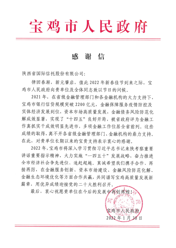 寶雞市政府向公司致感謝信