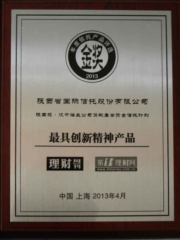 由國內(nèi)權威理財媒體《理財周刊》、《第一理財網(wǎng)》主辦的“2013年度信托產(chǎn)品評選頒獎典禮暨2012年度理財產(chǎn)品分析報告”最近在上海隆重舉行。我公司發(fā)行的“漢中繅絲公司集合資金信托計劃”作為創(chuàng)造性的扶持當?shù)剞r(nóng)業(yè)小微企業(yè)的典型代表,在此次“2013年度信托產(chǎn)品評選”活動中榮獲“最具創(chuàng)新精神產(chǎn)品金獎”。