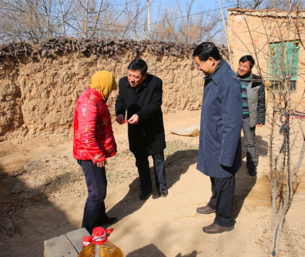2015年2月6日,公司黨委書(shū)記、董事長(zhǎng)薛季民、紀(jì)委書(shū)記、工會(huì)主席王曉燁帶領(lǐng)公司有關(guān)人員,前往省級(jí)“兩聯(lián)一包”定點(diǎn)扶貧村——澄城縣趙莊鎮(zhèn)高塬村扶貧慰問(wèn),為該村特困家庭和困難戶送去大米、食用油和慰問(wèn)金等,并帶去公司全體員工的親切關(guān)懷及節(jié)日祝福。