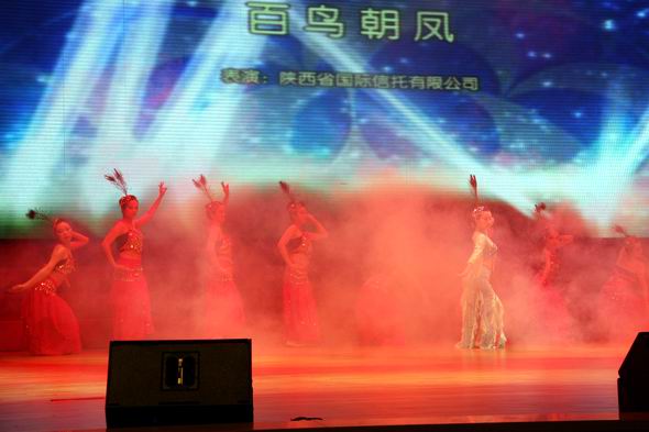 陜西銀行業(yè)慶祝建黨90周年文藝晚會(huì)于6月30日在西安市高新區(qū)管委會(huì)千人會(huì)堂隆重舉行。我公司員工演出的舞蹈節(jié)目《百鳥(niǎo)朝鳳》參加了演出?!栋嬴B(niǎo)朝鳳》寓意全國(guó)各族兒女心向共產(chǎn)黨,用藝術(shù)的手法表達(dá)華夏兒女對(duì)黨的熱愛(ài),也充分展現(xiàn)陜國(guó)投的公司風(fēng)采和員工的精神風(fēng)貌。