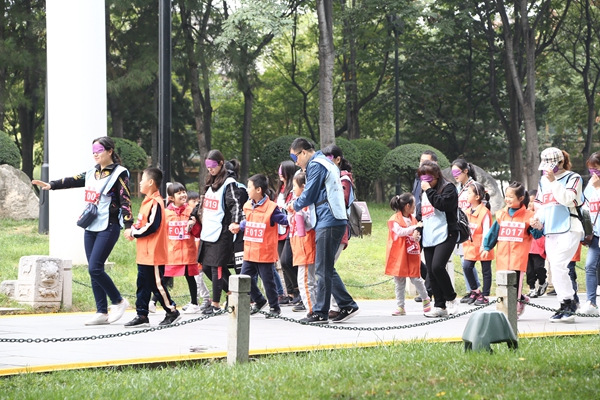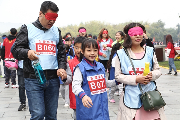 活動現(xiàn)場,近1000個小小志愿者和爸爸媽媽一起,手拉手陪伴100名視障兒童,共同環(huán)湖行走3.8公里。同時,家長們也蒙上眼罩,在小小志愿者引領下體驗盲人的世界,以此培養(yǎng)“奉獻、友愛、互助、進步”的志愿者精神。