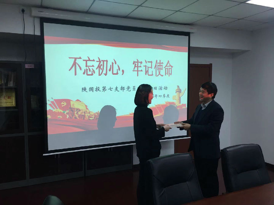 為認(rèn)真貫徹落實(shí)習(xí)近平新時(shí)代中國特色社會主義思想和黨的十九大精神,深入推進(jìn)全面從嚴(yán)治黨,進(jìn)一步創(chuàng)新“三會一課”內(nèi)容和形式,陜國投第七支部于2018年12月18日召開本年度第四季度黨支部大會,舉行“不忘初心,牢記使命”黨員政治生日主題黨日活動(dòng)。公司副總裁王曉雁以普通黨員身份參加,公司黨委副書記何熙平同志、黨委工作部副部長周小茹同志參會指導(dǎo)。