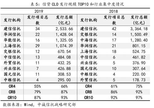 三是銀行系和央企系信托公司資產(chǎn)證券化業(yè)務(wù)展業(yè)突出。信貸CLO方面,2019年,建信信托、華潤(rùn)信托、華能信托新發(fā)行規(guī)模位居前三,其中華能信托從2018年的不足百億猛增到2019年的過(guò)千億。ABN方面,2019年,華能信托、天津信托、五礦信托新發(fā)行規(guī)模位居前三,天津信托、云南信托、金谷信托較上年新進(jìn)前十。