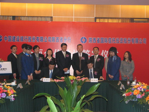 2007年2月12日下午,我公司與中國建設(shè)銀行股份有限公司陜西省分行在喜來登大酒店簽署了《全面合作協(xié)議書》,拉開了兩家單位在21個(gè)方面進(jìn)行全面合作的帷幕。公司黨委書記、董事長薛季民、黨委副書記兼紀(jì)委書記黎惠民、副總裁何熙平、副總裁趙輝、總會(huì)計(jì)師李玲及信托部門有關(guān)人員等參加了簽字儀式。建設(shè)銀行陜西省分行行長曾益、副行長魏承國,省分行機(jī)構(gòu)業(yè)務(wù)部總經(jīng)理于卉、省分行個(gè)人金融業(yè)務(wù)部總經(jīng)理?xiàng)罾竦瘸鱿炞謨x式。薛季民董事長、曾益行長先后發(fā)表了熱情洋溢的講話,共同祝愿雙方取得實(shí)質(zhì)性合作,實(shí)現(xiàn)雙贏。