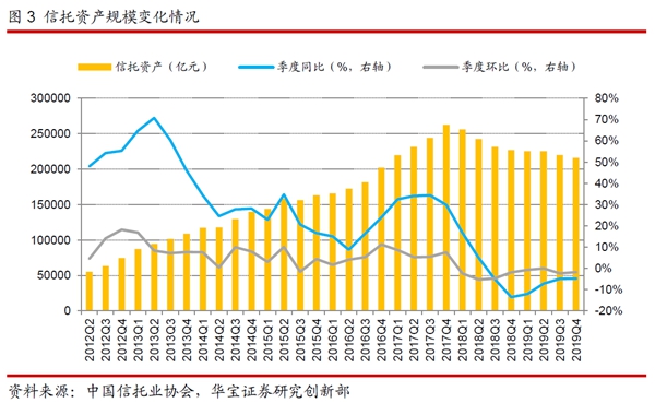 從2018年一季度開始,信托資產(chǎn)規(guī)模連續(xù)8個季度下滑。究其原因,一方面與監(jiān)管的收緊有關(guān),倒逼信托公司主要壓縮通道業(yè)務(wù)規(guī)模,持續(xù)向回歸信托本源、服務(wù)實(shí)體經(jīng)濟(jì)、強(qiáng)化主動管理能力的方向轉(zhuǎn)變;另一方面,也與宏觀經(jīng)濟(jì)增速持續(xù)下臺階有關(guān),信用風(fēng)險抬升,信托公司獲取合適資產(chǎn)的難度加大。到了2019年,這兩個因素依然存在,不過政策帶來的影響在邊際上有所改善。在經(jīng)濟(jì)下行壓力增大的背景下,宏觀政策逐步轉(zhuǎn)向“穩(wěn)增長、穩(wěn)杠桿”,“寬貨幣+寬信用”的政策組合使得經(jīng)濟(jì)增速預(yù)期好轉(zhuǎn),融資需求有所回暖。同時,央行關(guān)于資管業(yè)務(wù)的通知允許銀行自主制定整改計劃,有助于穩(wěn)定銀信合作中的銀行表內(nèi)和表外的資金規(guī)模,避免銀信合作規(guī)模過快下降。銀行理財可投非標(biāo)的明確規(guī)定將消除監(jiān)管不確定性,非標(biāo)資金端的改善有望帶來銀信融資類業(yè)務(wù)降幅趨緩。部分存量信托產(chǎn)品具有資金池特征,資管新規(guī)過渡期內(nèi)允許資金池類信托產(chǎn)品滾動發(fā)行對接新資產(chǎn),有利于減緩信托規(guī)模的下降。這些積極因素推動下,使得信托規(guī)模壓降的速度在2019年上半年有所放緩。不過在2019年下半年,對于通道業(yè)務(wù)和房地產(chǎn)信托的監(jiān)管加碼,通道業(yè)務(wù)和房地產(chǎn)信托業(yè)務(wù)均受到比較大的影響,信托規(guī)模壓降的速度重新擴(kuò)大。