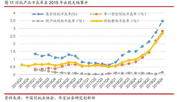 不良率快速攀升。具體來看,信托整體的不良率由2018年末的0.98%上升至2019年末的2.67%,不良率上升1.69個百分點(diǎn);集合信托的不良率由2018年末的1.51%上升至2019年末的3.48%,上升了1.97個百分點(diǎn);單一資金信托的不良率由2018年末的0.83%上升至2019年末的2.82%,上升了2個百分點(diǎn)。2019年單一資金信托的不良率上升的比集合信托要快,不過當(dāng)前集合信托的不良率仍高于單一資金信托。