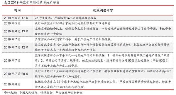 2016年國慶之后,盡管房地產(chǎn)調(diào)控政策不斷收緊,但是地產(chǎn)投資受到的影響比較小,地產(chǎn)投資增速持續(xù)上漲后維持在高位,2017-2019年三年房地產(chǎn)投資增速分別為7%、9.5%和9.9%,同時限購、限價、限貸、限售政策對于房地產(chǎn)開發(fā)商的資金回收形成較大影響,同時銀行等常規(guī)融資渠道也受到了限制,信托融資由于其靈活性受到了地產(chǎn)商的青睞。隨著2018年資管新規(guī)及其配套的各項(xiàng)政策的落地,政策的不確定性消除之后,房地產(chǎn)融資出現(xiàn)明顯回升,一直持續(xù)到2019年上半年。由于在2019年5月份開始政策對房地產(chǎn)的融資監(jiān)管進(jìn)一步收緊,2019年下半年地產(chǎn)融資明顯回落。