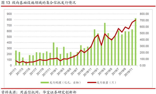 2019年下半年開始,房地產(chǎn)信托因調(diào)控而收緊,信托公司的業(yè)務(wù)則明顯轉(zhuǎn)向基礎(chǔ)產(chǎn)業(yè),2019年基建類集合信托發(fā)行規(guī)模明顯上升。具體來看,根據(jù)用益信托統(tǒng)計的數(shù)據(jù)顯示,2019年全年新發(fā)行的基礎(chǔ)產(chǎn)業(yè)類信托6981只,同比增長179.9%;新發(fā)行規(guī)模達(dá)6236億元,同比增長91.4%。其中,上半年發(fā)行規(guī)模2862億元,下半年發(fā)行3373億元?;A(chǔ)產(chǎn)業(yè)類信托發(fā)行規(guī)模明顯增長的原因主要有這三點(diǎn):