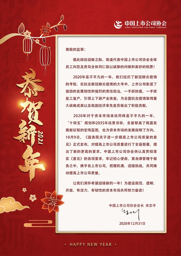 公司為中國上市公司協(xié)會監(jiān)事單位,為感謝我公司2020年以來對協(xié)會工作的大力支持,宋志平會長特向我公司發(fā)來了《新年賀信》。