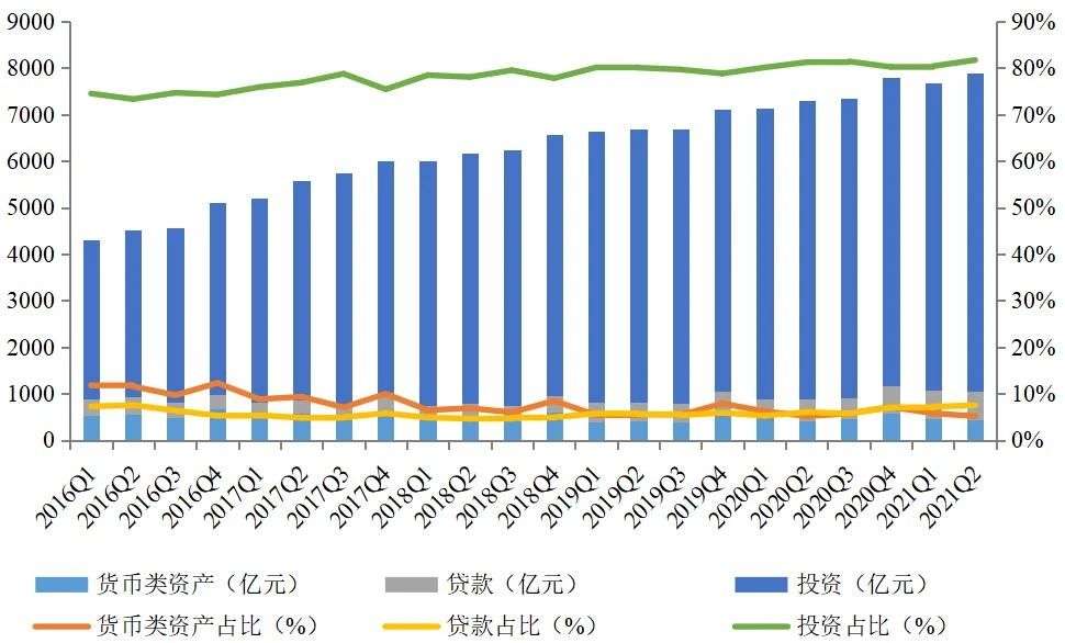 從固有資產(chǎn)的運(yùn)用方式來看,投資始終占據(jù)最重要的地位,且規(guī)模和占比都維持整體上升的趨勢(shì)。截至2021年2季度末,投資規(guī)模為6824.61億元,同比增長(zhǎng)6.45%,環(huán)比增長(zhǎng)3.32%;投資占比為81.70%,同比上升0.46個(gè)百分點(diǎn),環(huán)比上升1.30個(gè)百分點(diǎn)。貸款規(guī)模為625.90億元,同比大幅增長(zhǎng)31.26%,環(huán)比增長(zhǎng)5.54%;貸款占比為7.49%,同比上升1.45個(gè)百分點(diǎn),環(huán)比上升0.27個(gè)百分點(diǎn)。貨幣類資產(chǎn)規(guī)模為431.76億元,同比增長(zhǎng)5.37%,環(huán)比下降9.16%;貨幣類資產(chǎn)占比為5.17%,同比微降0.02個(gè)百分點(diǎn),環(huán)比降低0.62個(gè)百分點(diǎn)。
