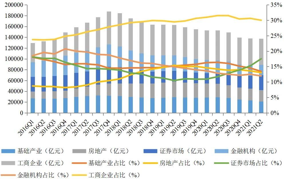 截至2021年2季度末,資金信托規(guī)模為15.97萬億元,同比下降9.56%。截至2021年2季度末,從資金信托在五大領(lǐng)域占比來看,排序分別是工商企業(yè)(30.00%)、證券市場(chǎng)(17.52%)、基礎(chǔ)產(chǎn)業(yè)(13.42%)、房地產(chǎn)業(yè)(13.01%)、金融機(jī)構(gòu)(11.97%)。