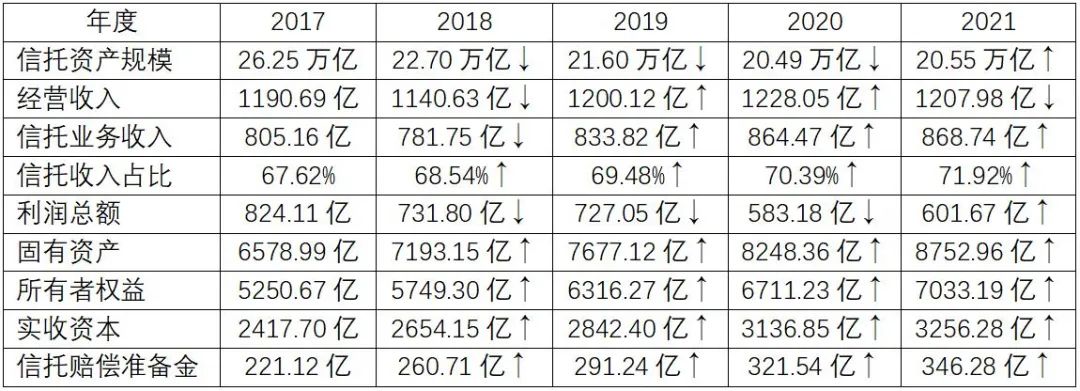 表一 2017-2021年信托業(yè)規(guī)模、業(yè)績(jī)和資本變化一覽表